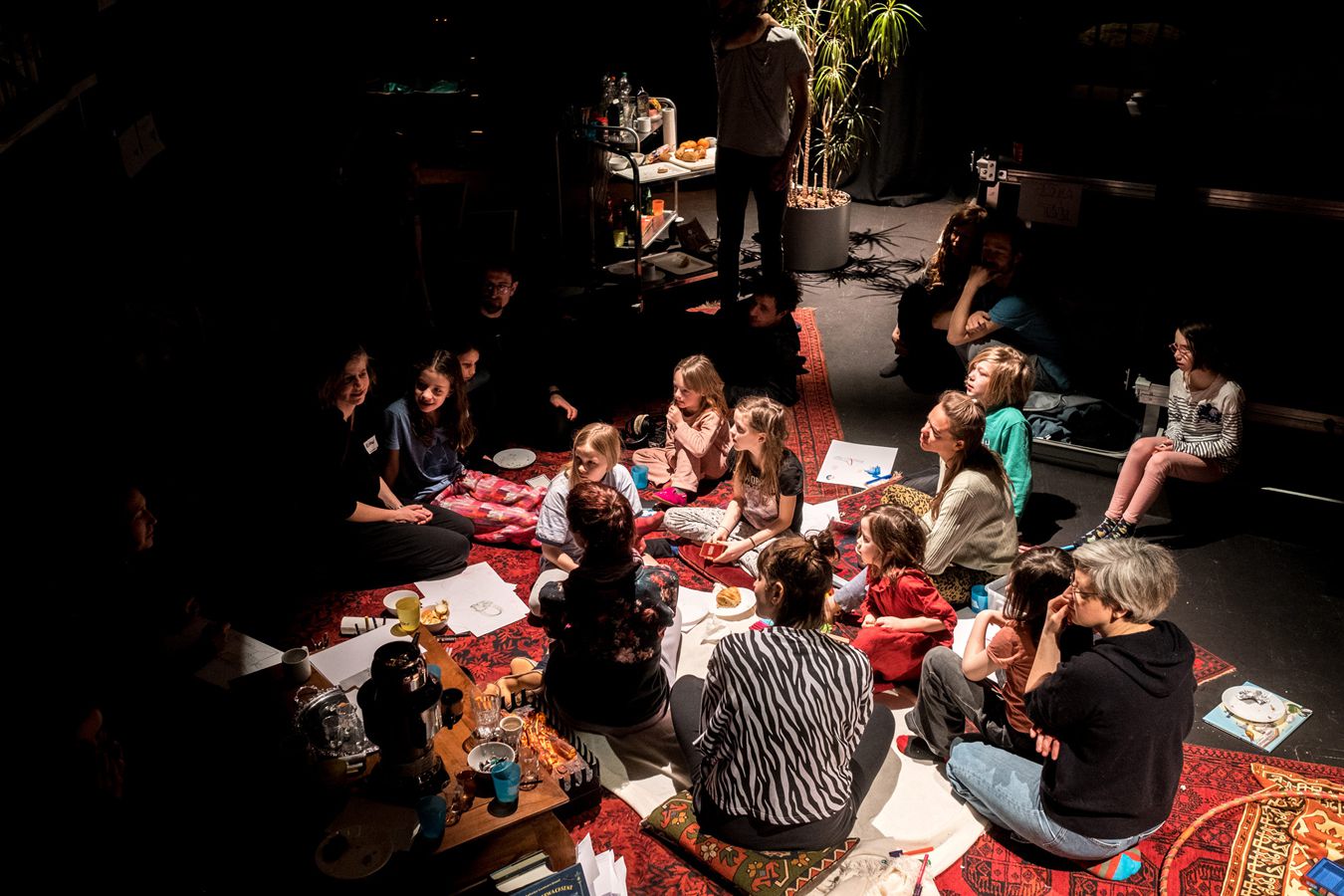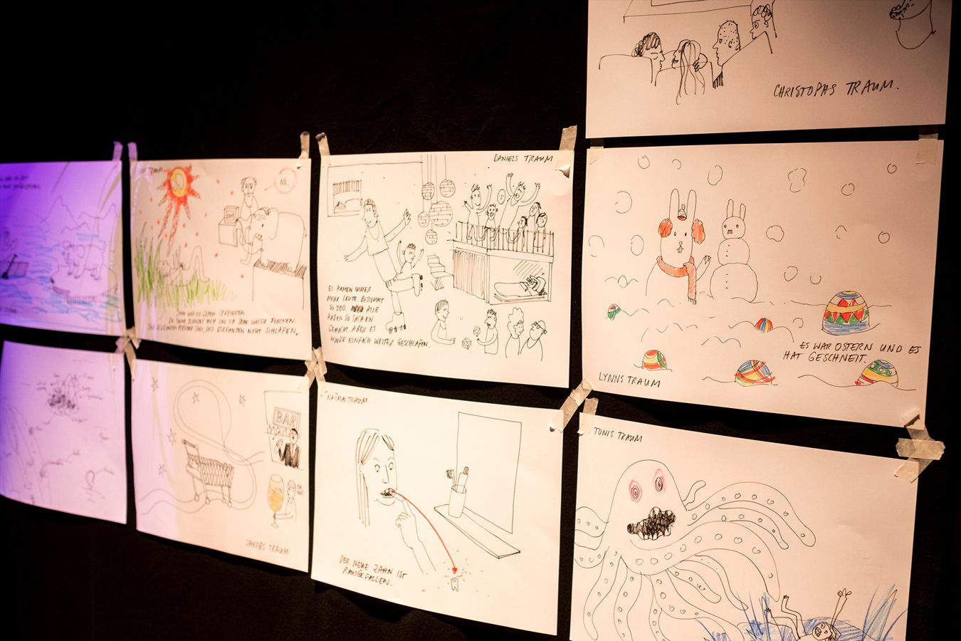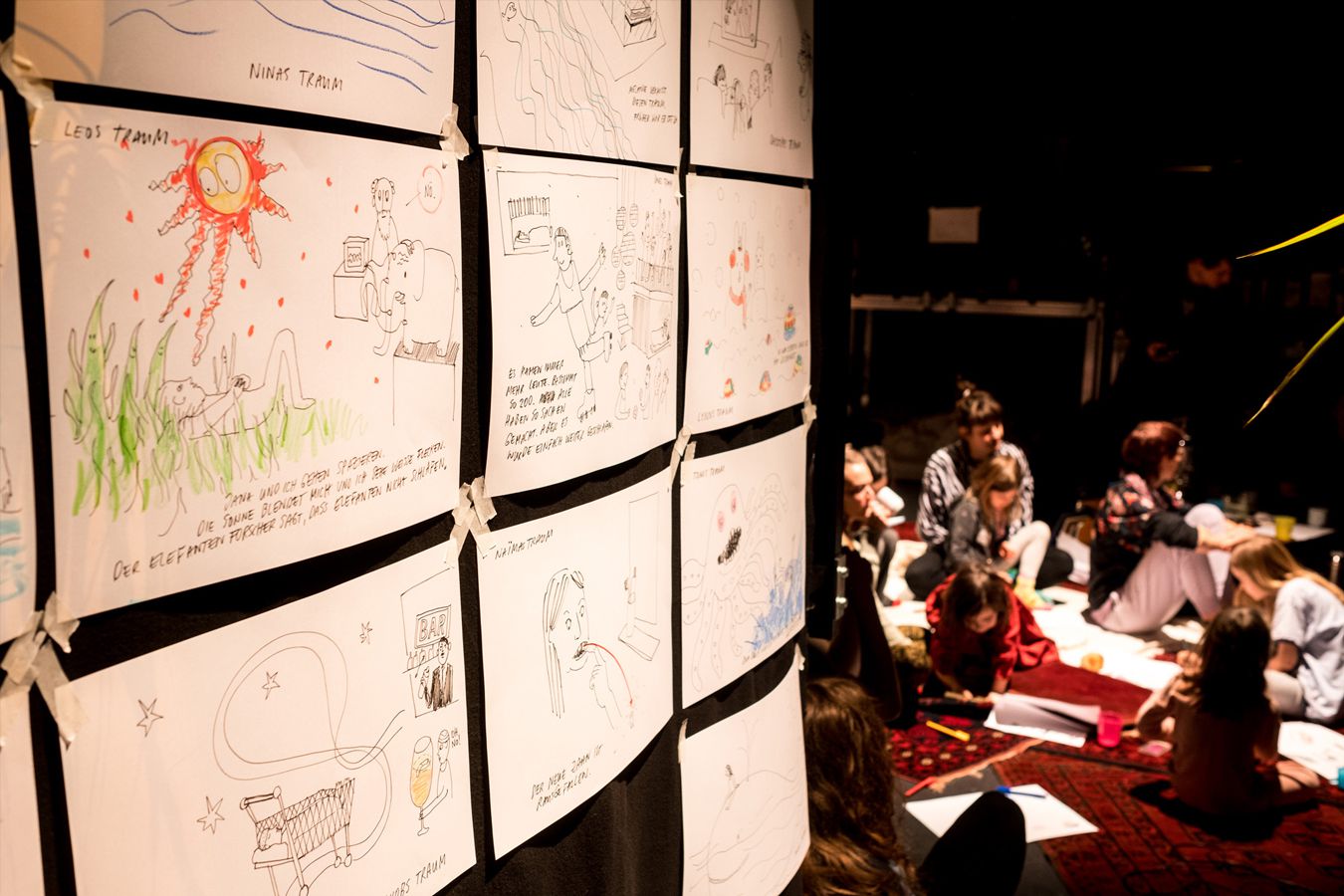 Der Theatersaal wird zum Schlafsaal. Im Fundustheater erforschen Kinder und Erwachsene den Schlaf. Noch sehr verschlafen kommen die Gäste früh am Morgen mit ihren Traumbildern zu mir, die ich zu Papier bringe. Kinder mit Alpträumen hatten die Erlaubnis, mich zur Traumbannung auch zu wecken.