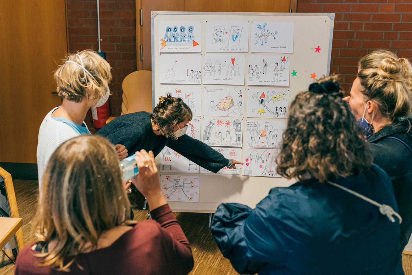 Antriebskräfte, Routenplanung und Planetenerfindung: Workshops zur kulturellen Schulentwicklung der Kulturagent*innen Hamburg an diversen Hamburger Schulen. Zeichnungen zur Visualisierung der Projektideen.