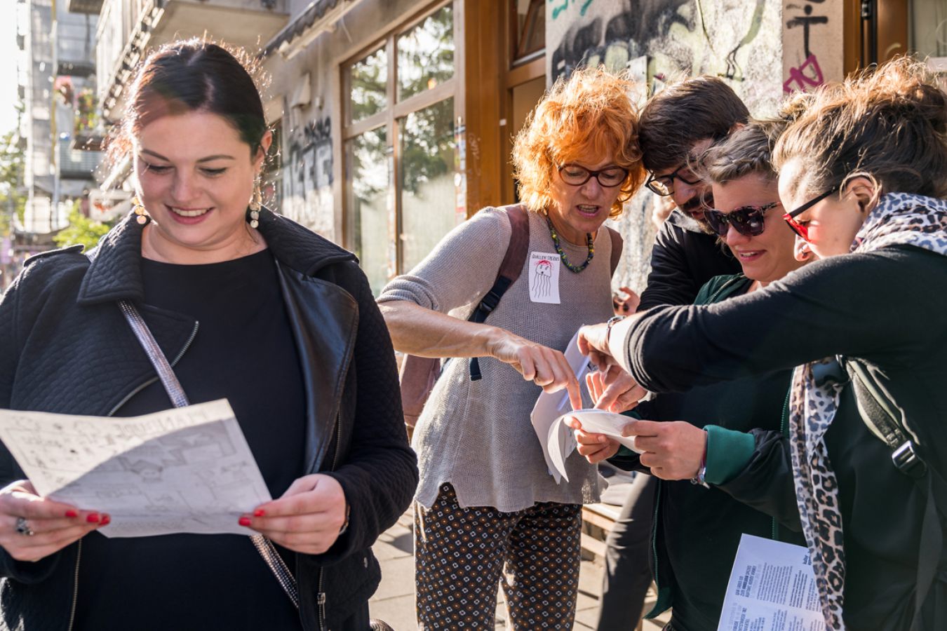 Touristen in der PopUp-Stadt mit der Krassolonia Map -