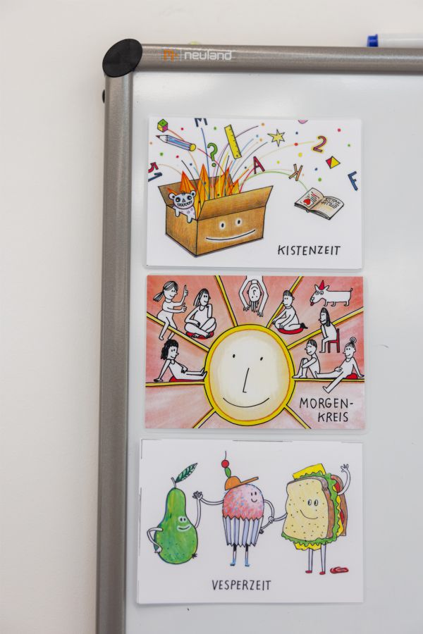 Was ist heute dran - und in welcher Reihenfolge? Jeden Morgen wird mit den Kindern der Schöpflin-Grundschule der Tagesablauf mit Hilfe der Karten visualisiert.