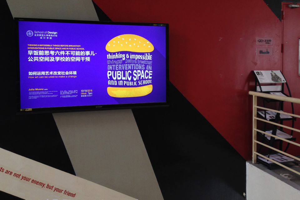 2016 gab ich meinen ersten 6-wöchigen Workshop an der Beijing Normal University in Zhuhai, China. Als Erstsemster sind die Student:innen zum ersten Mal weg von zu Hause und erwarten, im Unterricht klare Anweisungen zu bekommen. Ich irritiere sie mit meinen Methodenshots: Mit spielerischen Elementen und Gruppenübungen setze ich den Fokus auf den Prozess. Sie sind zum ersten Mal mit den Lehrmethoden einer westlichen Dozentin konfrontiert und ich zum ersten mal mit einer außerordentlichen Sprach - und Kulturhürde. Selten wird, es im Raum so leise, wie wenn ich z.B. ein Meinungsbild abfrage, um sie über den weiteren Verlauf der Stunde mitentscheiden zu lassen.