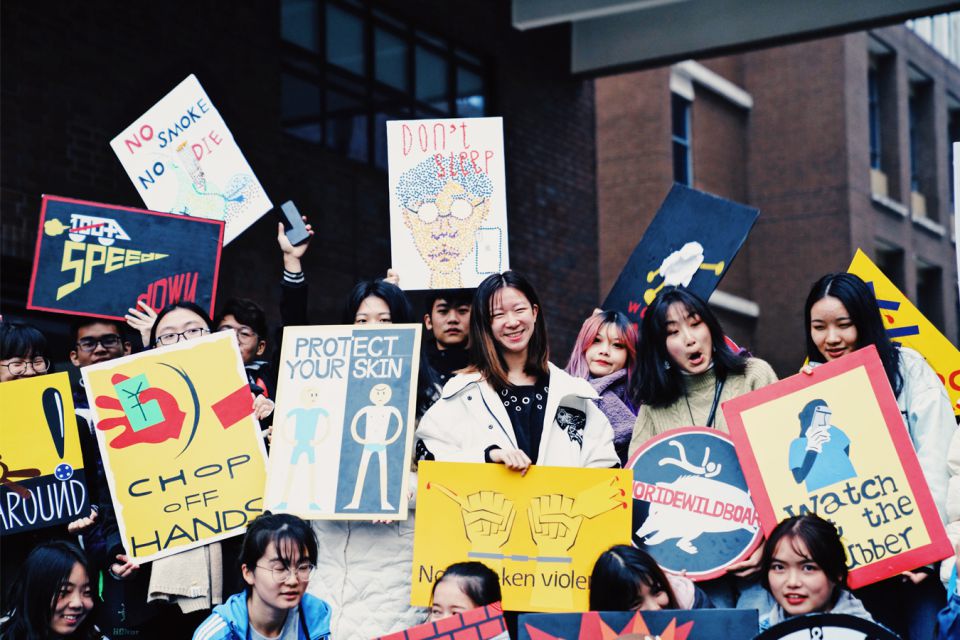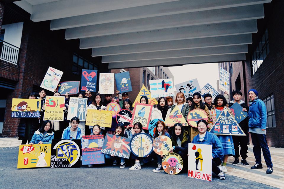 Für ihr Projekt wählten sie eine Message, erstellten eine Illustration und produzierten ein Schild mit Klebefolien, das sie an einem öffentlichen Ort dokumentierten. 2017