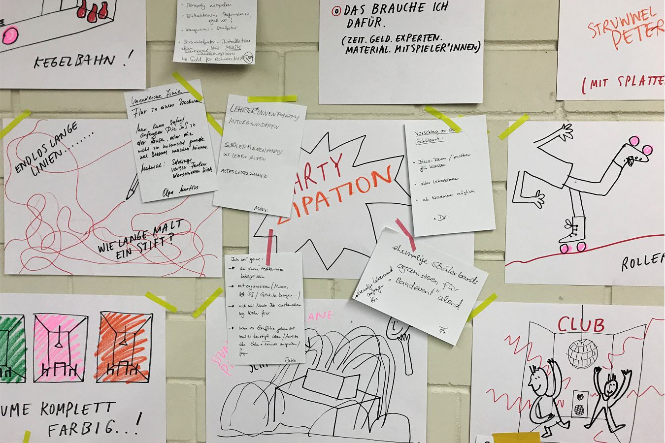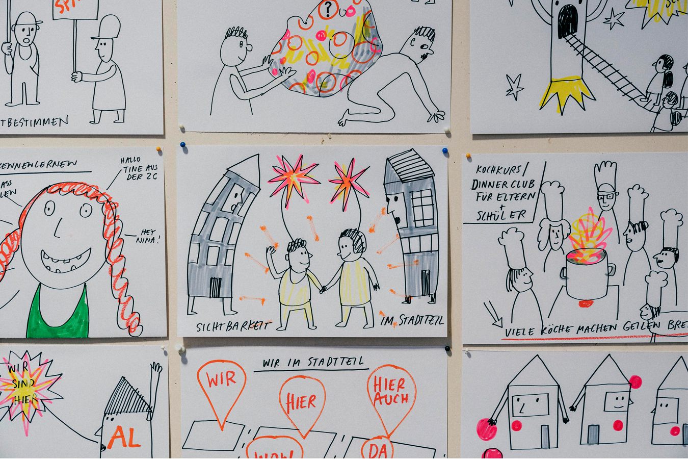 Antriebskräfte, Routenplanung und Planetenerfindung: Workshops zur kulturellen Schulentwicklung der Kulturagent*innen Hamburg an diversen Hamburger Schulen. Zeichnungen zur Visualisierung der Projektideen.