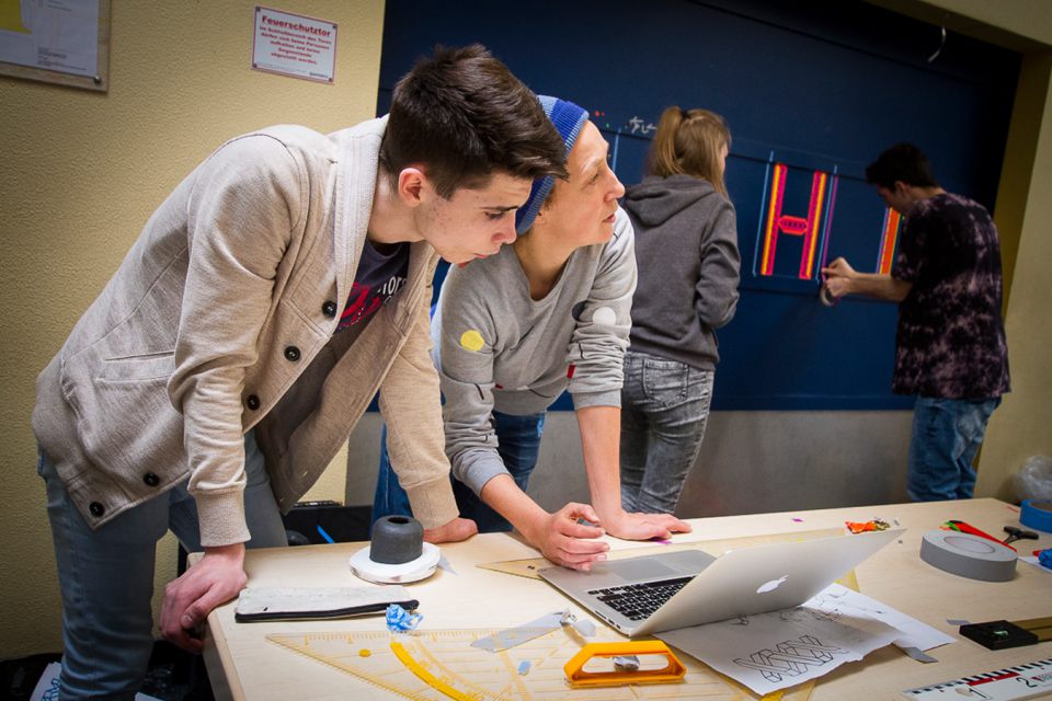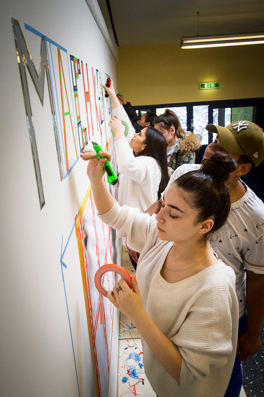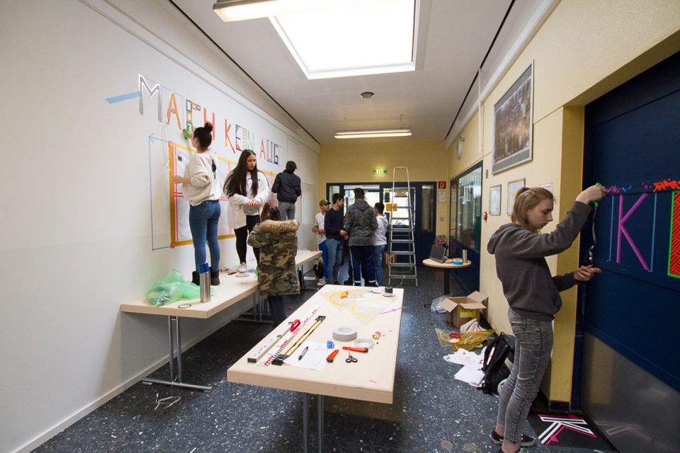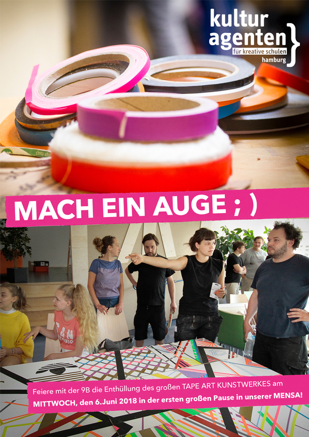 Mach kein Auge! - so nennt die Klasse 7F ihr großes Tape-Wandbild. Mit dem Wandbild im Hintergrund entsteht eine Präsentationsfläche vor der Aula, damit die Kunst der Schüler:innen aller Jahrgänge sichtbar wird.